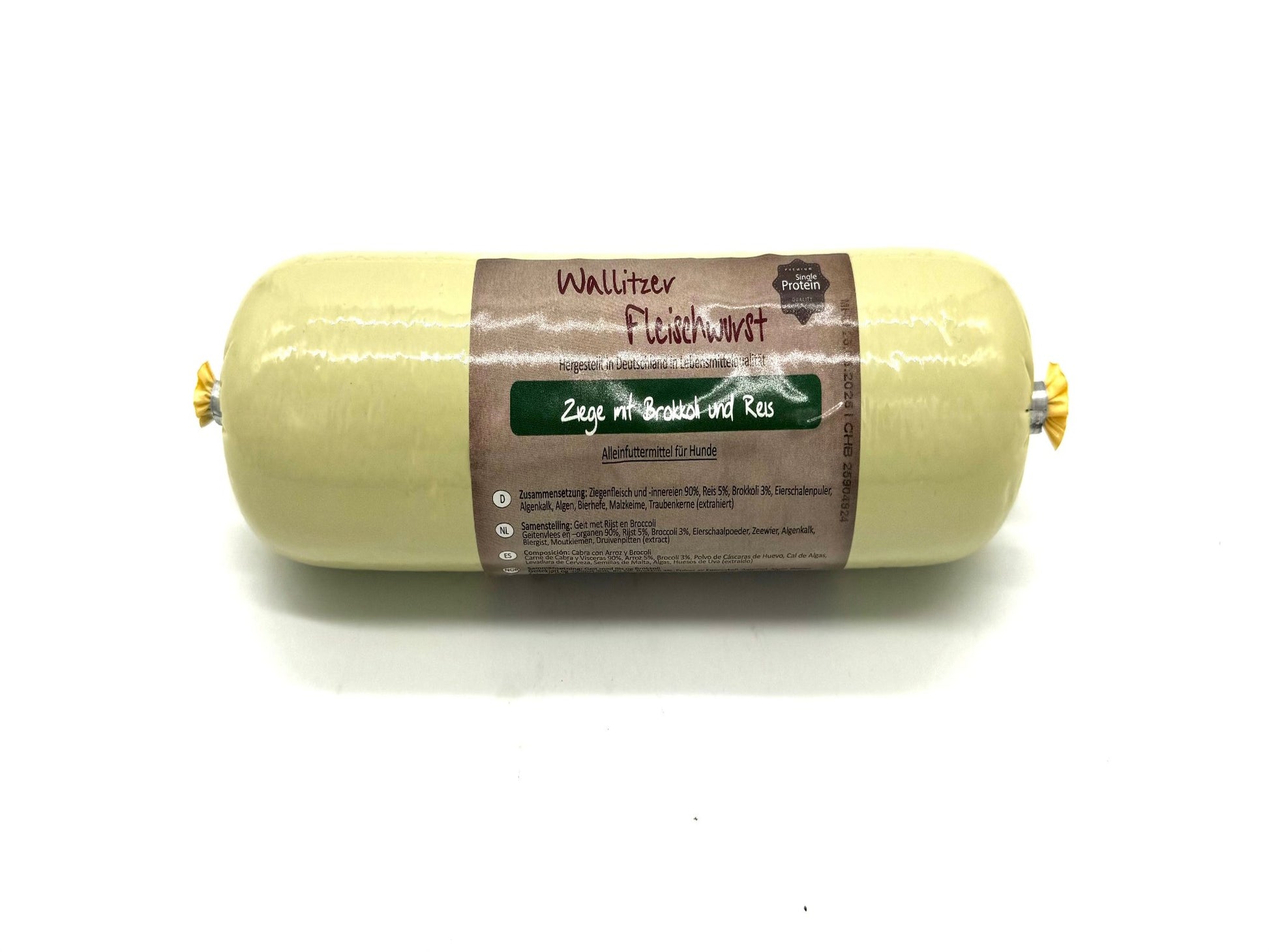 Ziegenfleisch und -innereien 90%, Reis 5%, Brokkoli 3%, Eierschalenpulver, Algenkalk, Bierhefe, Malzkeime, Algen, Traubenkerne (extrahiert)